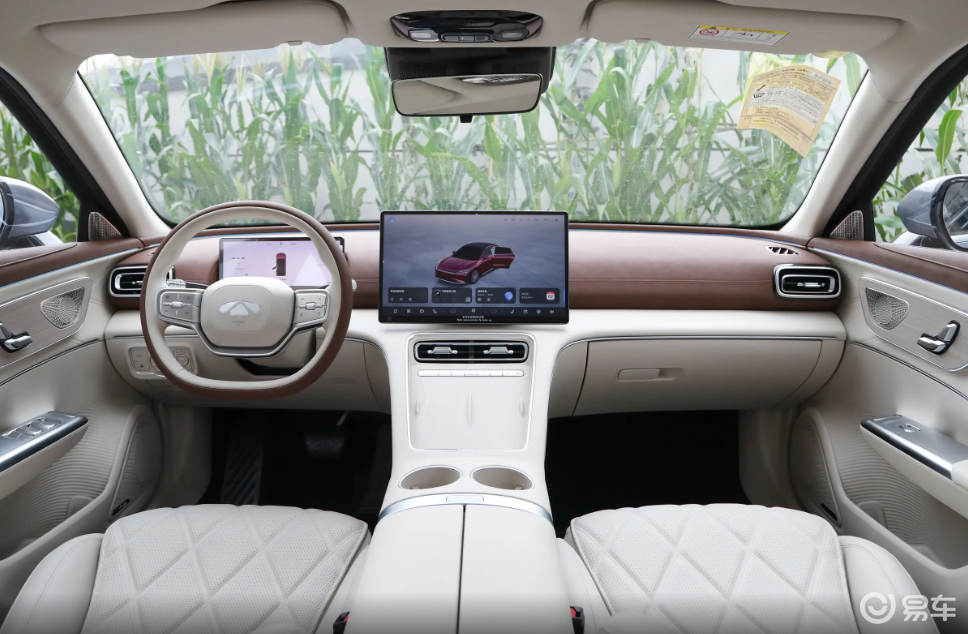 内饰方面,风云A9L四座版内饰采用了高雅的棕/米白双色配色,中控台采用环抱式设计,配备了双辐式多功能方向盘+15.6英寸中控屏,整体风格简洁