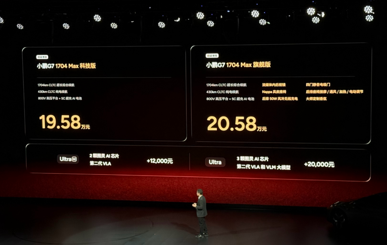 智能配置方面,G7标配高通骁龙SA8295P座舱芯片、1颗750TOPS算力的图灵AI辅助驾驶芯片。和P7+一样,Ultra版或选装Ultra SE智能升级包,可获得额外的2颗图灵AI芯片,升级第二代VLA激光雷达以及第二代VLA大模型,并将支持天玑AIOS6.0车机系统+小鹏VLM大模型。