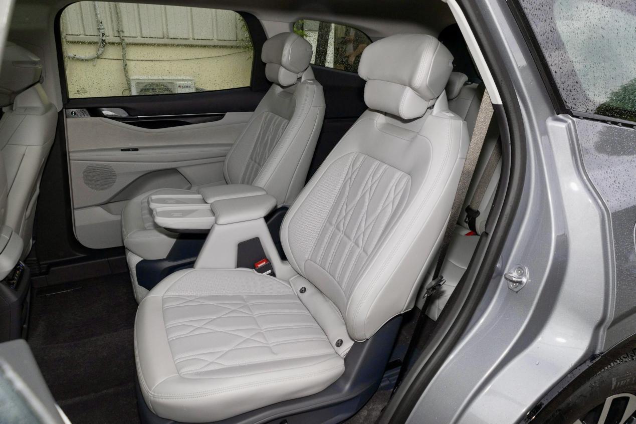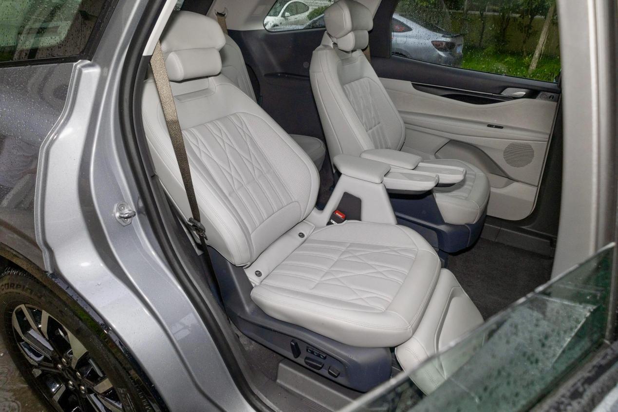 福特锐界L坐起来也非常舒适,它的座椅是根据人体工学设计的云享舒压座椅,座椅坐上去支撑性也比较到位,而且福特锐界L 223的座椅布局,它二排座椅还有腿托,所以它有一个一键近零重力模式,当你打开这个模式,它的座椅靠背就会向后仰41°,腿托会向上抬起50°,达到一个类似于零重力模式,之前在青岛开福特锐界L去苏州的时候我体验过,我只要坐在二排就会打开这个一键近零重力模式,再配合座椅通风,躺在上边不管是玩手机也好,还是睡觉也好,都非常的舒适。