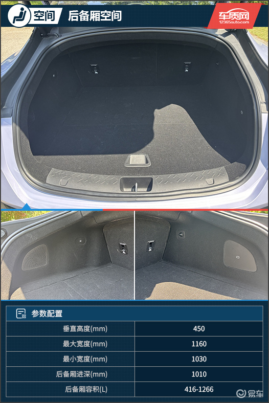 根据官方数据显示,评测车后备厢常规容积为416L,放倒后排座椅后可扩充至1266L,装载空间较为灵活,并可满足日常使用需求。后备厢内部设计非常规整,只是功能性较为单一,两侧并未提供网兜、挂钩等装置,仅提供了12V电源接口。好在置物板下方还设置有一个储物格,稍稍弥补了这一不足。