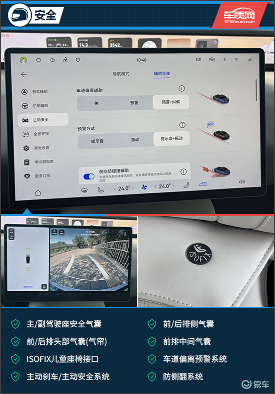 安全配置方面,评测车搭载了丰富的主/被动安全配置。诸如主/副驾驶座安全气囊、前/后排侧气囊、前/后排头部气囊(气帘)、前排中间气囊、车道偏离预警系统、防侧翻系统在评测车上均有配备,可以有效提升行车安全性。而在电池安全方面,评测车搭载宁德时代高安全电芯,结合航天级气凝胶隔热材料、四重泄压防护结构和高效液冷系统,确保极限环境下依然“零热蔓延”。