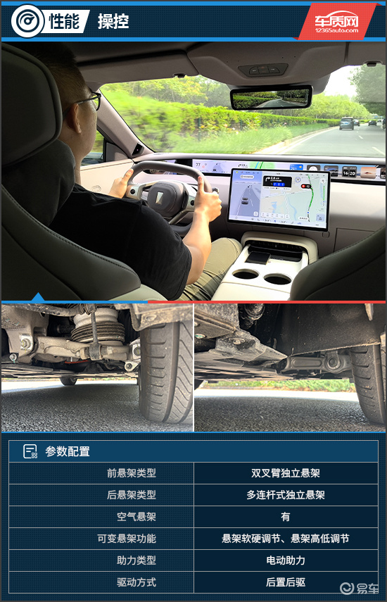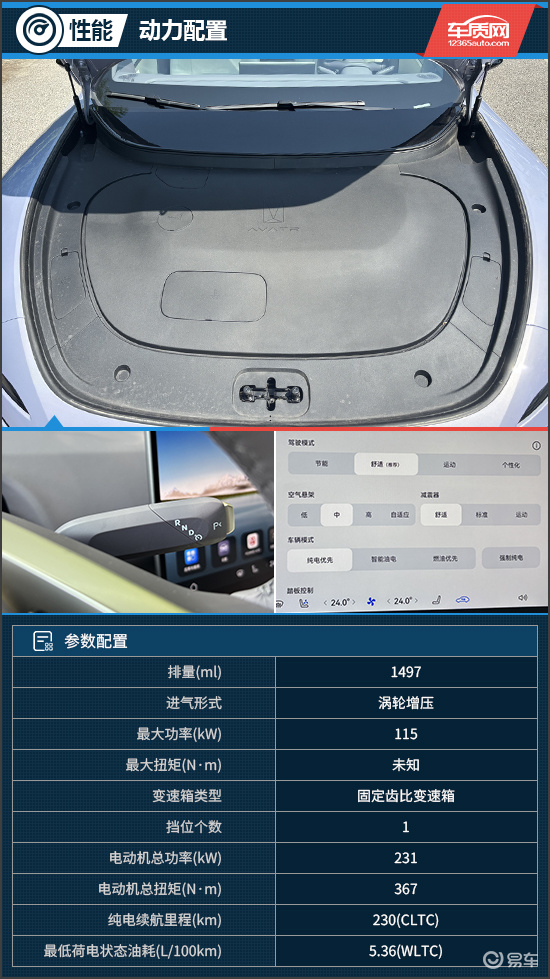 评测车搭载由1.5T发动机与后置单电机组成的增程式动力系统,发动机最大功率115kW,电机总功率231kW,总扭矩367N·m,匹配容量为31.7kWh的磷酸铁锂电池,CLTC纯电续航里程为230km,CLTC综合续航里程达到1190km。