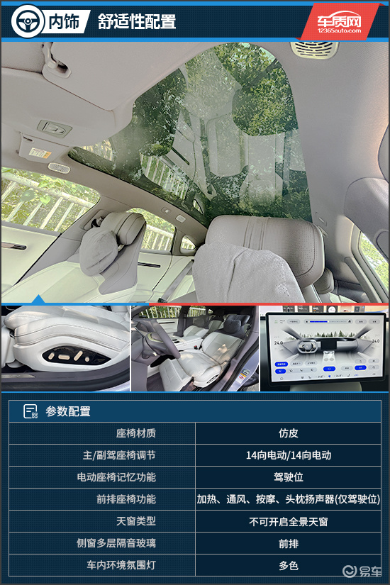 舒适配置方面,评测车配备不可开启全景天窗,虽未配备物理遮阳帘,但防晒效果依然出众。同时,其标配纳米水离子空调系统,可实现杀菌、除味与抗敏作用。座椅方面更具看点,前排配备同级罕见的双零重力座椅,采用十层舒适结构,支持双“120°躺姿”和一键放倒功能,并集成加热、通风、按摩、头枕扬声器(驾驶位)等多项功能,可为主副驾人员带来深度放松体验,实现了座椅舒适性的均衡共享。