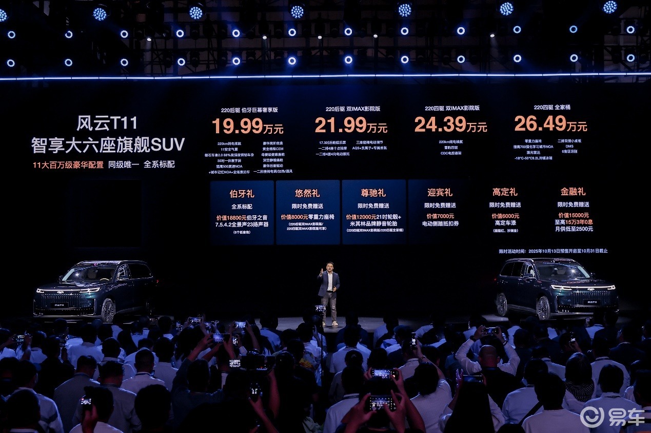 风云T11已正式开启预售,共推出4款版型,其中220后驱伯牙巨幕奢享版预售价19.99万元;220后驱双iMax影院版预售价21.99万元;220四驱双IMAX影院版预售价24.39万元;220四驱全家桶预售价26.49万元。同时,发布会现场公布了以下多重极具诚意的预售权益。