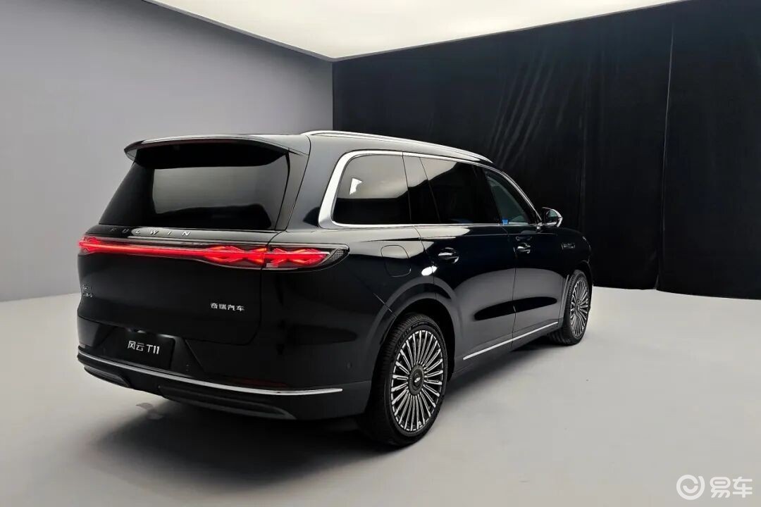 从外观设计上来看,风云T11前脸直瀑式镀铬面板搭配半封闭格栅,营造出大气庄重的视觉感受。车身侧面线条挺拔,配备20/21英寸密幅轮毂,车窗与车身比例协调,整体造型魁梧饱满。车尾的贯穿式波浪形尾灯与双C型日行灯前后呼应,展现出较强的设计一致性。