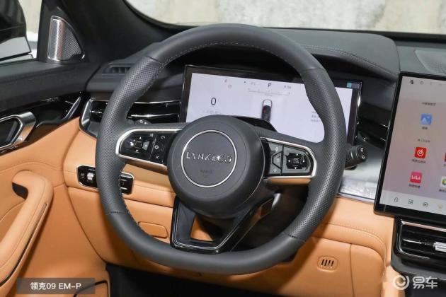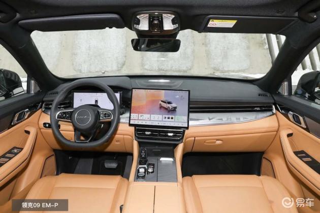 领克09的内饰在配色与材料上都应用了更多混搭,中控呈现出倾斜面,主驾有12.3英寸数字仪表+12.8英寸HUD组合,而中控的15.4英寸2.5L屏则连同出风口一起完成侧倾偏向,扶手箱前端则是短电子挡把与驾驶模式、多媒体快捷控制组合。另外,真皮材料会从方向盘覆盖到座椅,用料方面还是更扎实一些。